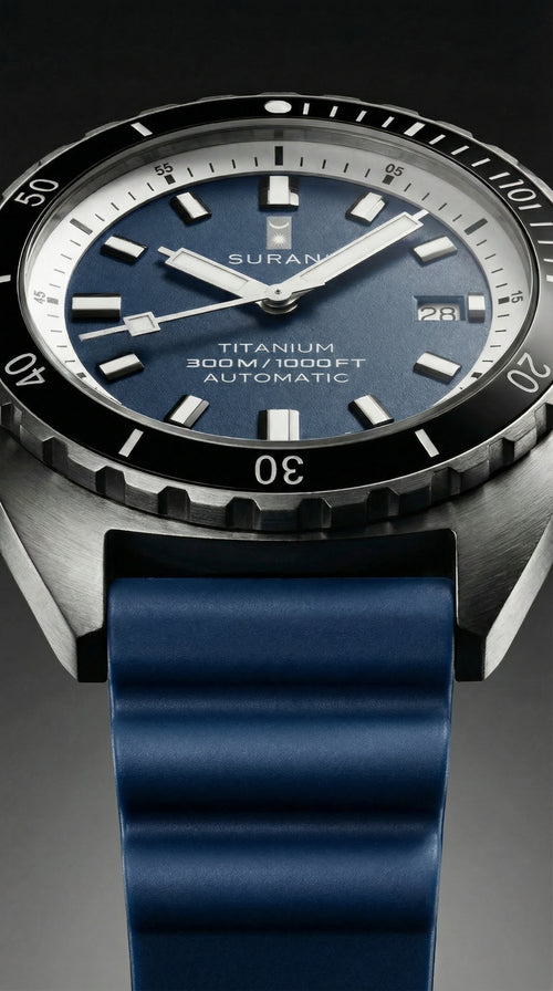 Mariner One is a Swiss-powered titanium diver’s watch built for 300 m (1000 ft) depth, featuring a ceramic bezel, sapphire crystal, and green Super-Luminova for perfect underwater visibility.